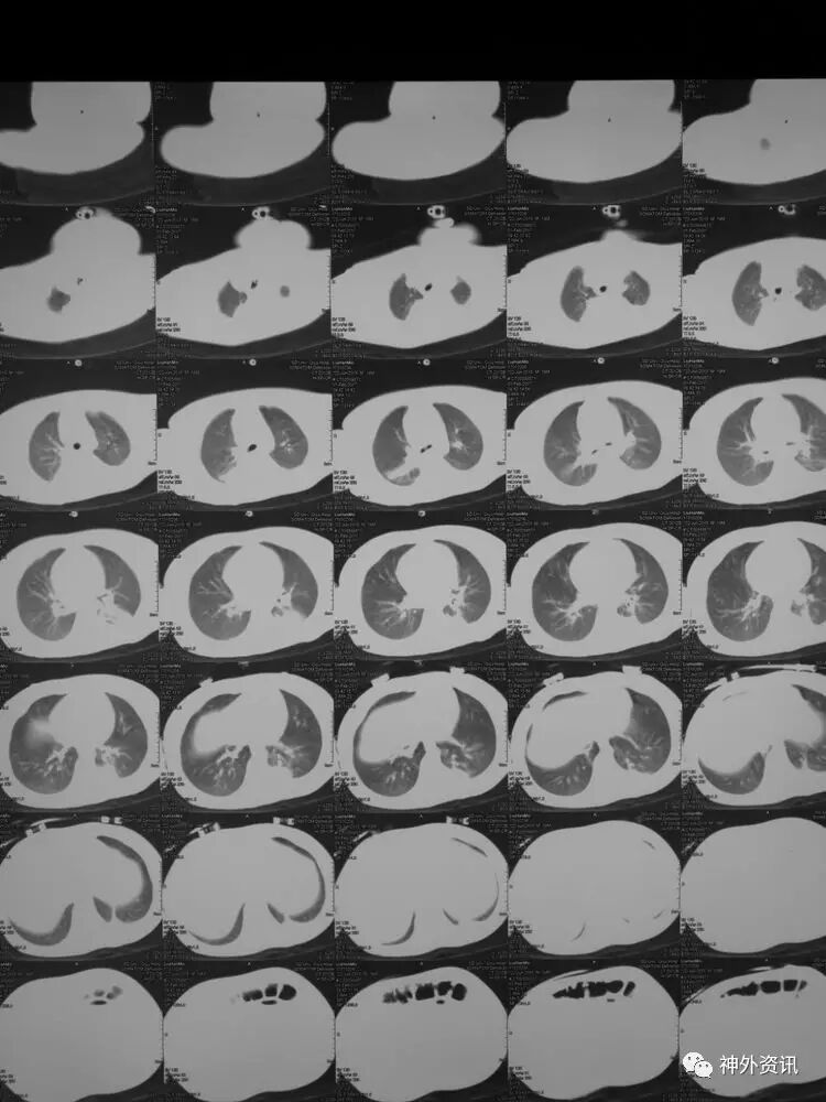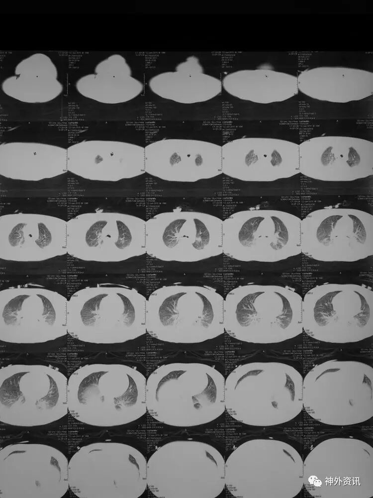 2017.2.1:术后2天复查颅脑CT,结果示中线居中,右侧半球低密度并SAH,左侧半球未见明显异常,左侧脑沟可见显示,双肺少量炎症,不能放松警惕,继续同前治疗。