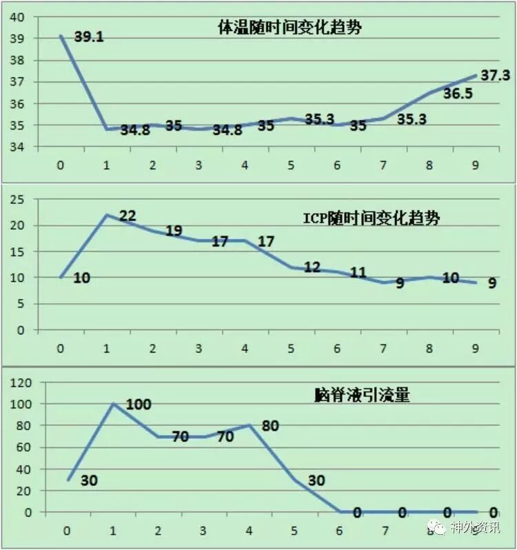 术后体温,ICP,脑脊液引流量遂时间变化趋势见下图: