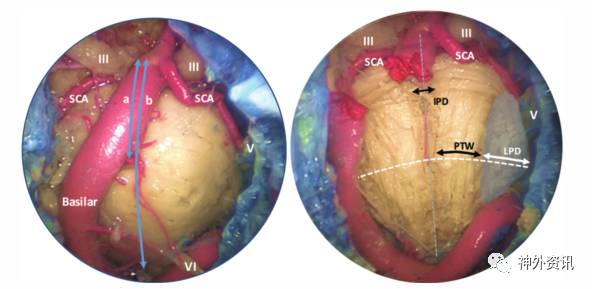 图1. 桥脑腹侧结构,左图为血管移位前,右图为血管移位后,可见白质纤维走行。a/b=PBMI;IPD=锥体束间距离;LPD=椎体束外侧距离;PTW=锥体束宽度;SCA=小脑上动脉;III=动眼神经;V=三叉神经;VI=外展神经。