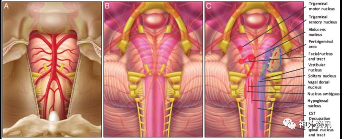 图4. A图示脑干的暴露情况;B图示深面的CST;C图为深层的神经束和核团。