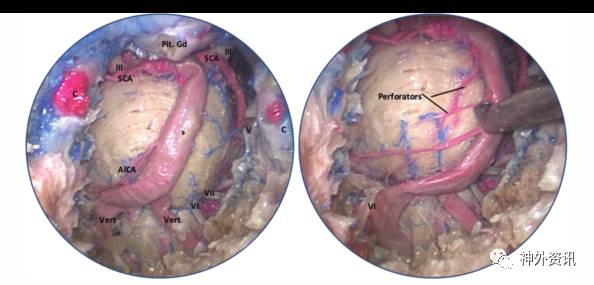 图3. 左图:暴露桥脑延髓结构;右图:基底动脉穿支。AICA=小脑前下动脉;B=基底动脉干;C=颈内动脉;Pit Gd=垂体;SCA=小脑上动脉;Vert=椎动脉;III=动眼神经;V=三叉神经;VI=外展神经;VII=面神经。