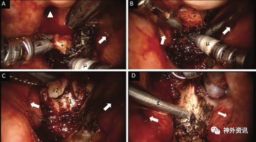 图3. 磨除蝶骨、鞍底和切除肿瘤的术中照片。A.打开蝶窦分隔(§)前,所见蝶窦和鞍部(#);B和C.用单极电刀(μ)和控制CO2激光(L)打开鞍底硬膜(dm);D.肿瘤全切后见鞍隔塌陷(白色星)。