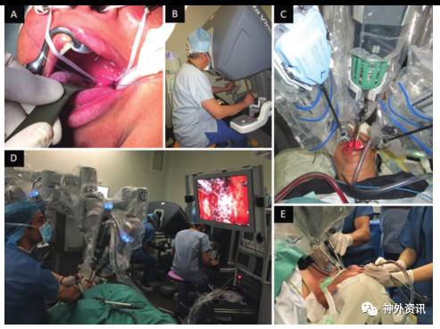图1. 术中照片。A.用环状牵开器牵开软腭;B.头颈外科医生使用机器人切开咽部的黏膜;C.切开黏膜时摆放机器人器械臂;D和E.神经外科医生在患者床边磨除蝶骨。