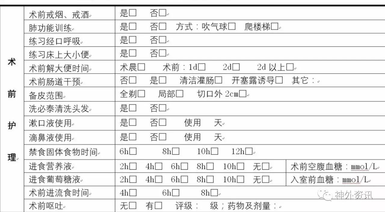 唐都医院神经外科ERAS术前护理项目记录单