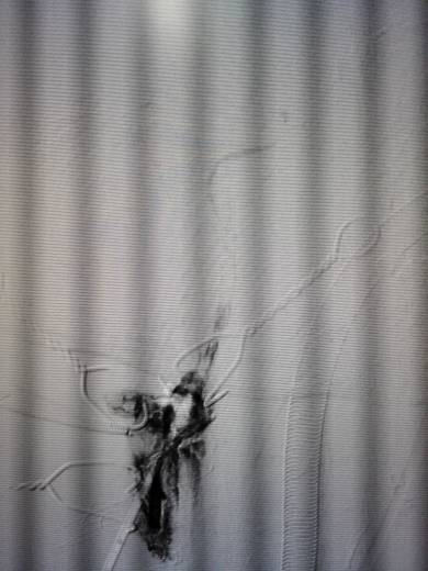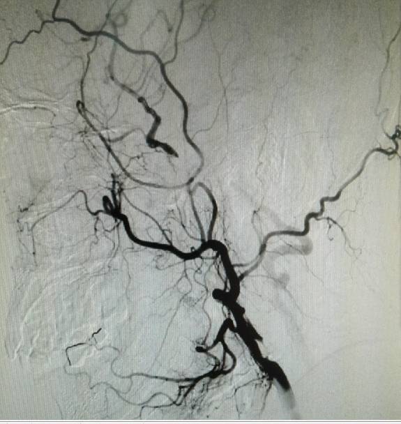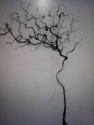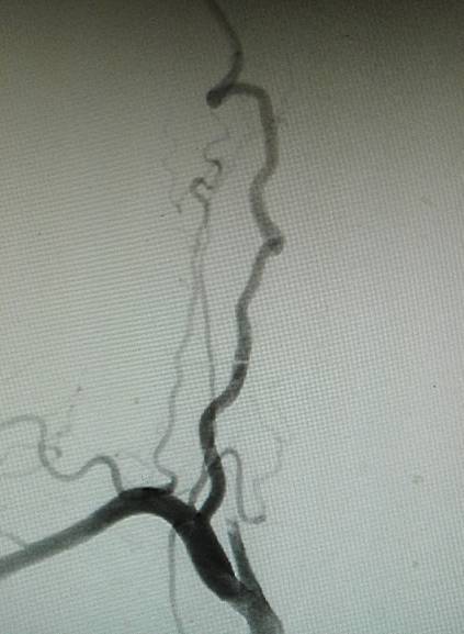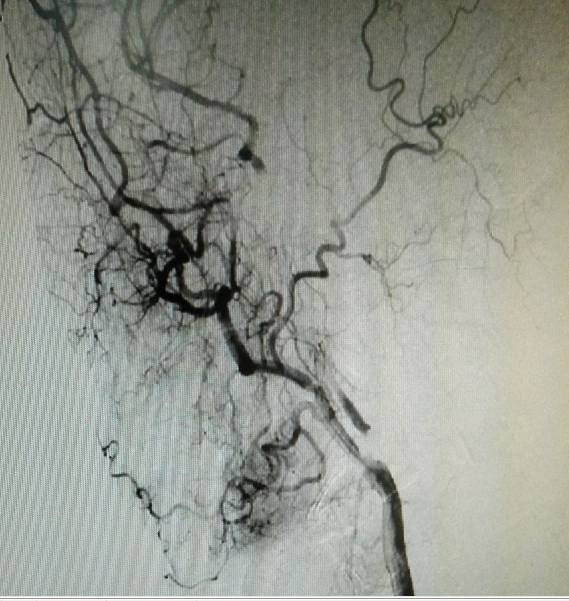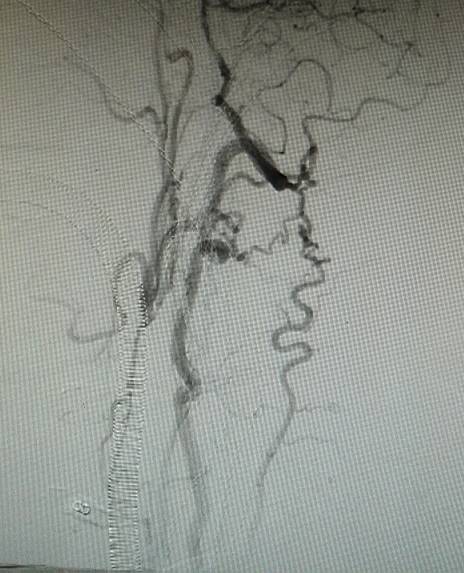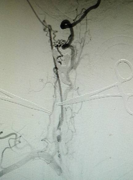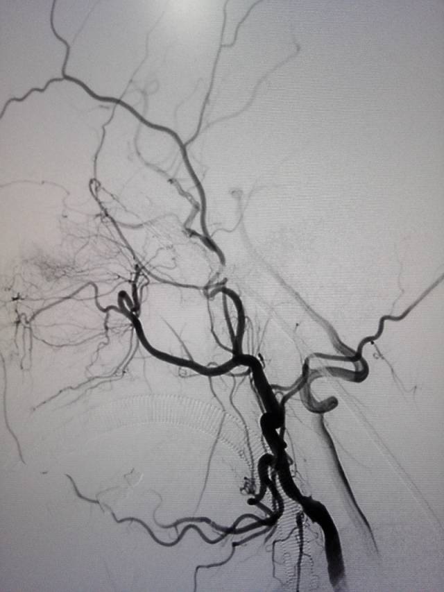 术前造影:右侧颈总动脉起始部显影,其余部位闭塞。颈外动脉向颈内动脉代偿供血。