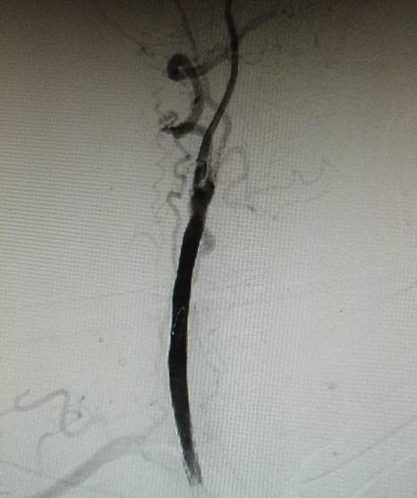 然后球囊扩张,植入颈总动脉支架,造影示,右侧颈总动脉显影好。