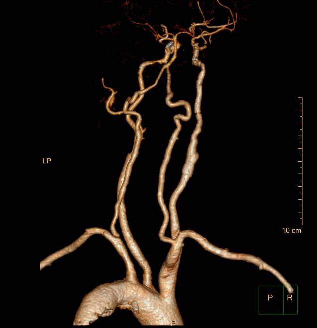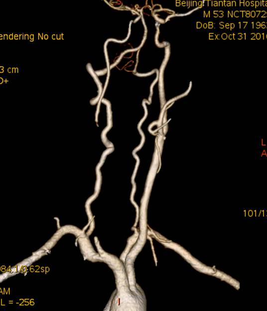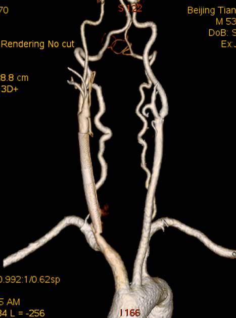 术后七天CTA示:颈总动脉及颈内动脉较术后增粗。