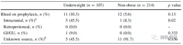 表1. 低体重组与非肥胖组患者接受药物预防VTE时发生出血事件的统计。