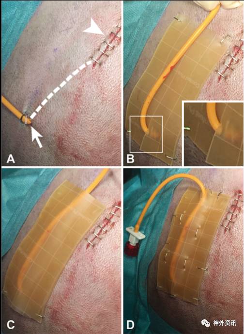 图1. A、B、C和D. 脑室外引流管简易固定法。