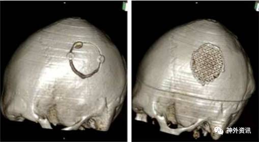 图1. 1例典型病例的术前和术后头颅CT三维重建图,钛网完整覆盖颅骨缺损区域。