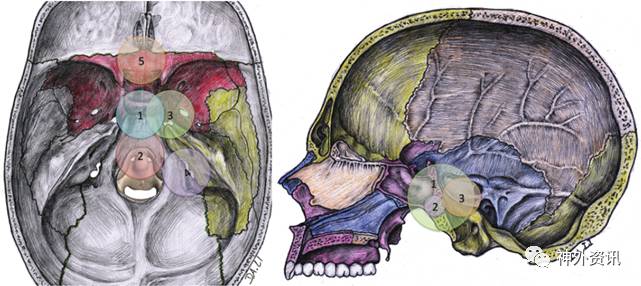 图1. 左图:根据肿瘤位置的分型:1.SC型;2.OC型;3.SP型;4.PO型;5.ES型和6.广泛型(图中未显示)。右图:按骨质侵犯状况分类:1.内生型;2.固有型和3.外生型。