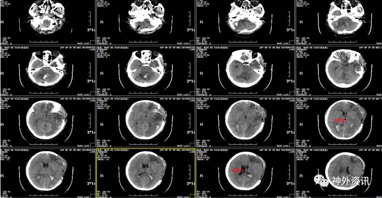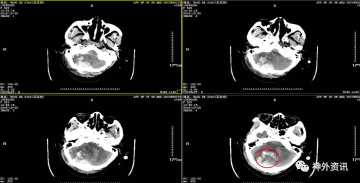 2016.12.20:术后第1天,患者意识仍昏迷,自主呼吸尚可,出现双瞳不等大,左瞳3.0mm,右瞳2.0mm,光反射消失,复查头颅CT发现,原小脑挫裂伤灶出血明显增加,周围水肿明显,环池仍不清。