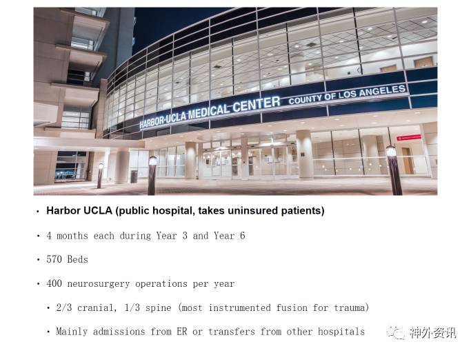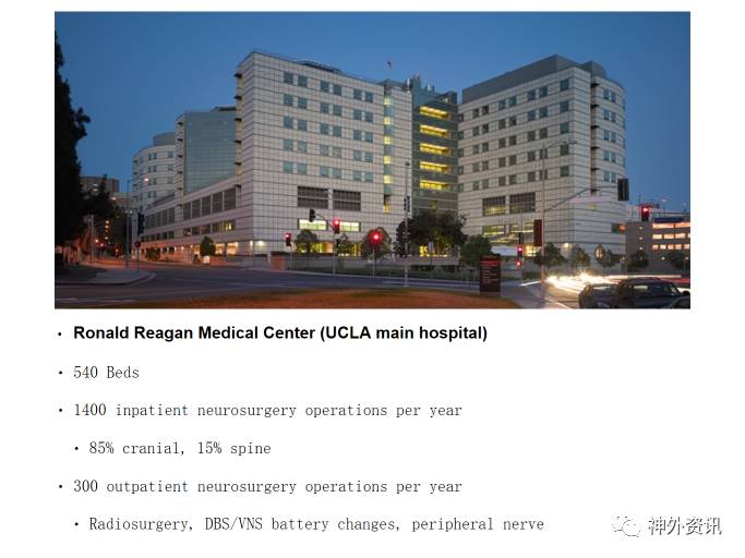 导读:Scharnweber介绍了目前UCLA附属的几大医学中心:罗纳德里根医院作为主院,拥有540张床位,每年神经外科手术量在1700台左右。