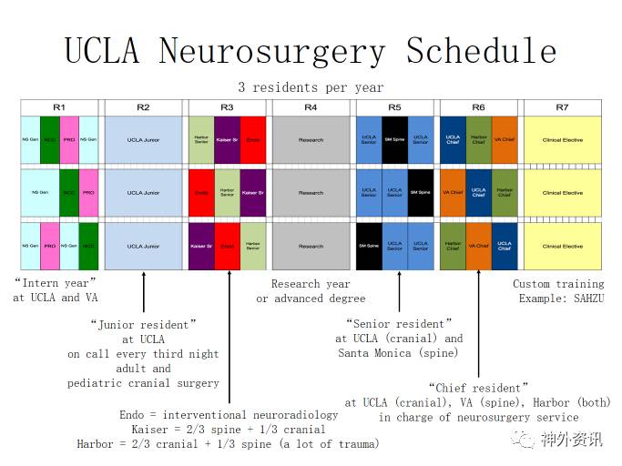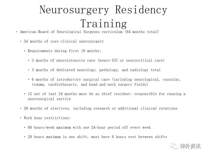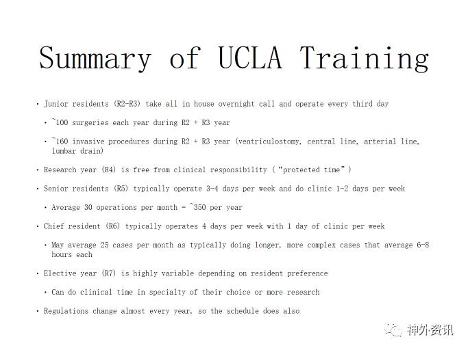 导读:ABNS神经外科住院医师培训计划:总体时间为84个月,其中54个月为核心临床神经外科训练,另外30个月可选择科研训练或额外临床轮转。54个月中包含NICU,相关科室轮转(神内、病理等)和适应性外科科室轮转(头颈外科,血管外科等)。最后2年内必须担任住院总医师满12个月。UCLA对工作时间的限制:每周最高工作时长为80个小时,且需包含一个完整的24小时休息;值班时间不超过28小时,每班之间必须有8小时休息。而Scharnweber医师指出,实际生活中,住院医师需要早上5点半到医院开始一天的工作,晚上一般8、9点离开医院,如有手术的话可能更晚,非常辛苦。