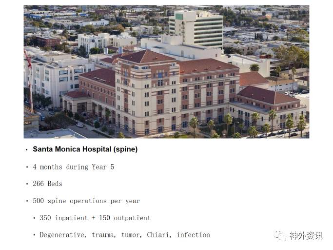 导读:Santa Monica医院主要以脊柱手术为主,住院医师轮转期间必须在第五年时在此医院进行四个月的脊柱神经外科的训练。