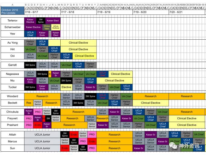 导读:这是不同年资住院医师的轮转安排表;可以看出,UCLA为住院医师的培训制定了宏观的框架,而又充分尊重了每一位住院医师自主选择的权利,为自由发展铺平了道路。且这种自主性随着年资的升高逐渐增加,身为第七年的住院医师,可以完全自主选择这一年的安排。