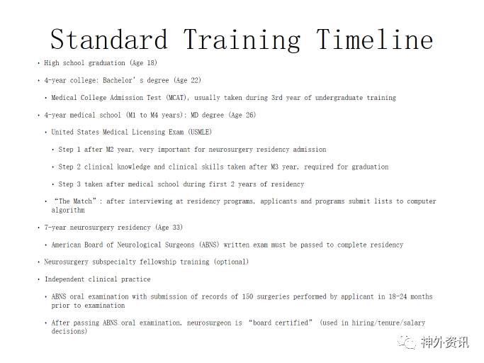 导读:神外医师“成长”时间表:按照18岁高中毕业来算,4年本科毕业后进入医学院苦读4年,期间需要通过USMLE医师执照考试(医学院第二年考出step 1,第三年后可参加step2考试,住院医师前2年内需要通过step3考试)。医学院毕业后参加match选择神经外科为专业方向后,即开始7年住院医师生涯。期间需要通过ABNS考试(分为笔试及口试),方可成为行业认证的医师,此时年龄33岁。