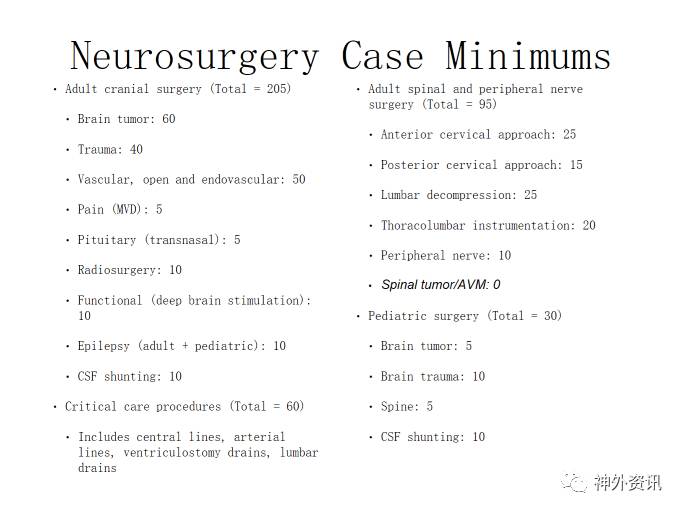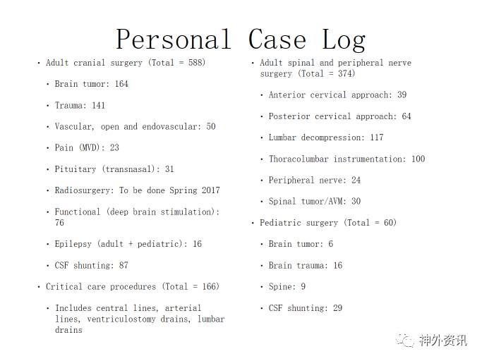 导读 :在专培期间需要达标的手术量如上所示,主要分为四大类:成人颅脑疾病、成人脊柱及周围神经疾病,临床操作和小儿神经外科疾病。Scharnweber医师指出,在UCLA经历7年的培训后,上述指标均能超额完成,一些住院医师在培训中逐渐发展出了自己感兴趣的亚专业方向,会着重增加相关手术的训练量。