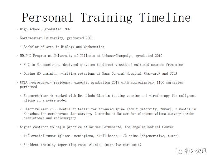 导读:Scharnweber医师个人的履历表:在住院医师专科培训第四年,他参与了Dr Linda Liau关于胶质瘤疫苗的研究。而在第七年时,Scharnweber选择了6个月的KAISER医院训练功能区唤醒手术,3个月在浙二神外培训脑血管疾病手术,最后3个月回到UCLA罗纳德里根医院进行颅底手术的训练。