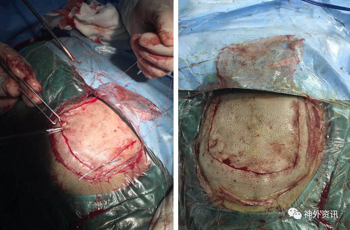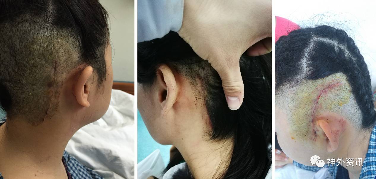 我们的优化措施:硬膜、皮下采用可吸收线缝合,皮肤采用可吸收线皮内缝合。为满足现代人对于手术效果要求不断的提高,对于切口美观效果的进一步追求,我们利用可吸收抗菌缝线缝合硬脑膜及帽状腱膜,不仅避免了传统丝线的排异外露,更可起到抑制细菌在切口繁殖的抗感染效果;利用可吸收倒刺线进行皮肤的美容缝合,既确保了更好的伤口愈合效果,也减少了患者术后伤口的疼痛与不适、拆线的痛苦和完全不必要的等待拆线的住院时间,极大促进了患者的加速康复。