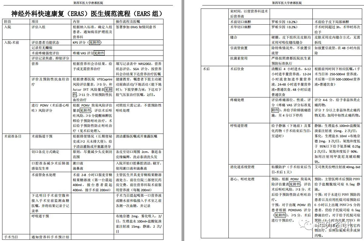 加速康复外科(ERAS)与微创外科是引领21世纪现代外科前进的两个重要发展方向。加速康复已经在普通外科等很多学科取得了令人瞩目的效果,但是目前尚无在神经外科应用的报道。唐都医院率先成立神经外科ERAS协作组,严格规范地制定了开颅手术ERAS流程,并积极开展临床实验,取得了患者恢复快、并发症低、住院时间短等显著的效果,我们将对神经外科开颅手术ERAS进行详细的系列报告。欢迎大家关注。