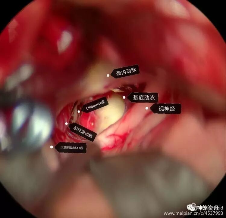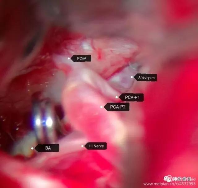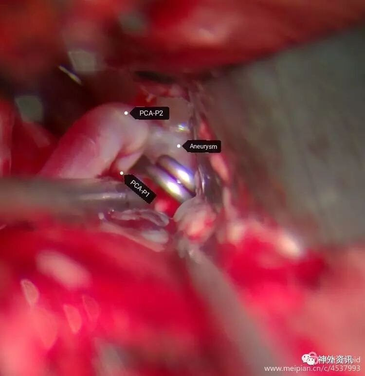 继续深入暴露大脑后动脉P1段及其穿支血管,接近动脉瘤颈。