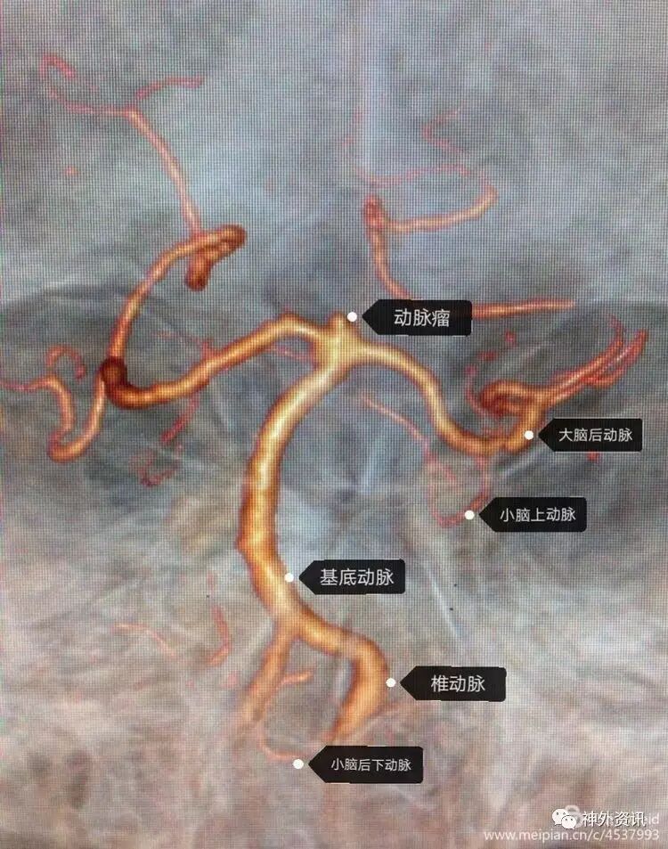 显示基底动脉尖动脉瘤和相关血管形态,可见动脉瘤窄蒂,瘤顶不规则,判断为责任病灶。双侧P1、P2血管形态正常。