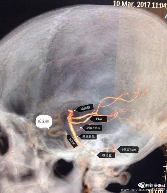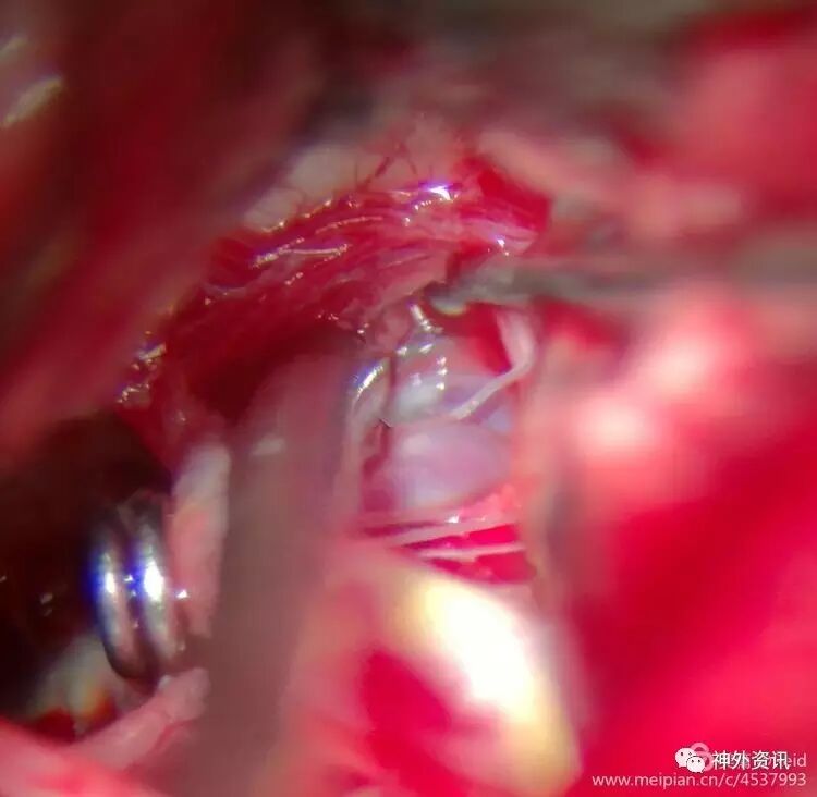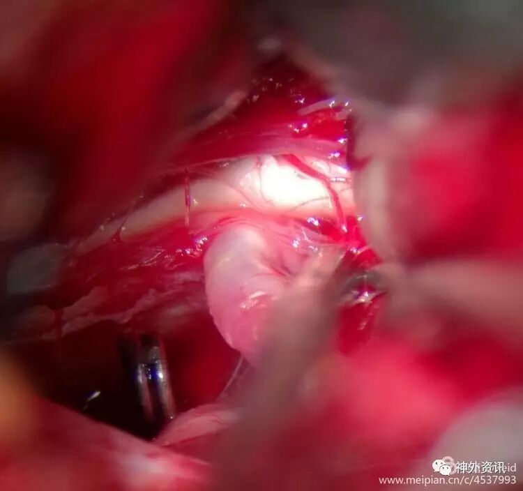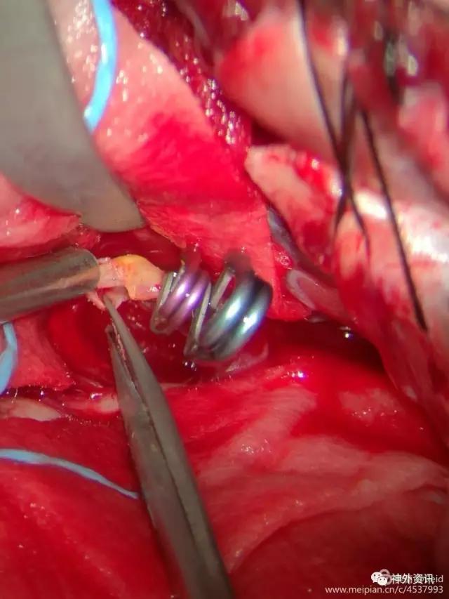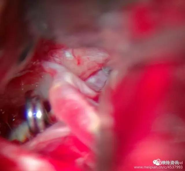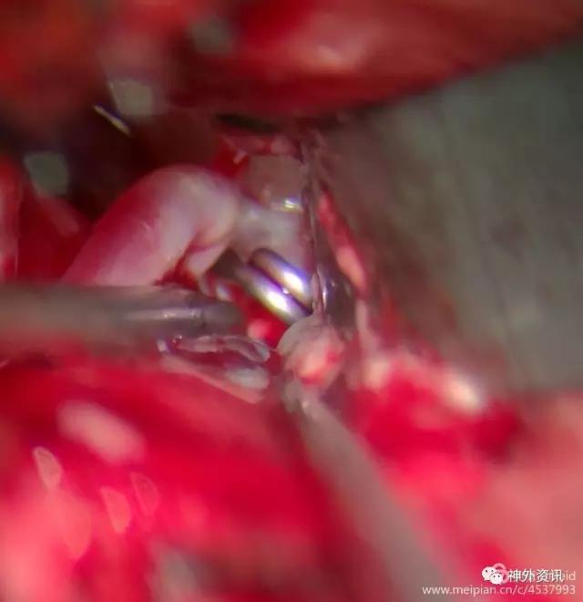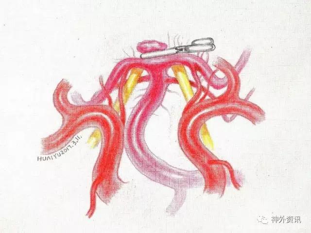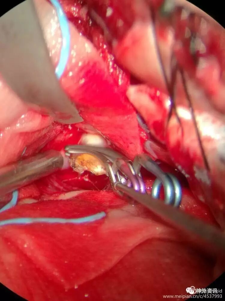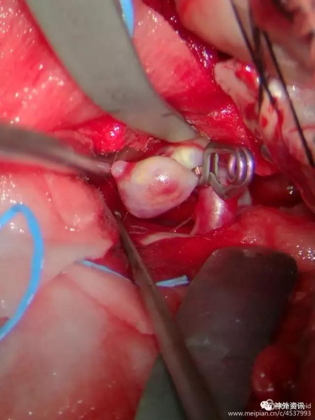 小心剥离动脉瘤颈前、后方,仔细辨认穿支血管,小心保护,之后以一枚mini动脉瘤夹顺利夹闭动脉瘤颈,瘤体缩小,瘤颈右侧根本没有空间暴露及窥视,祈祷没有穿支血管误夹。