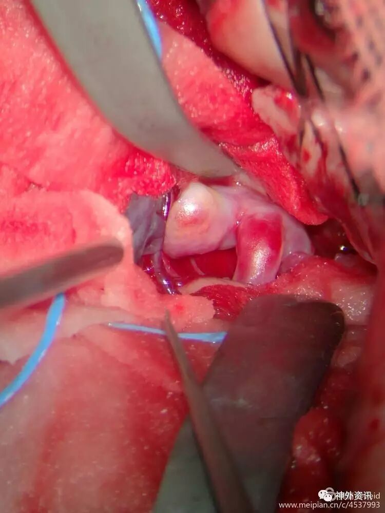 可见基底动脉尖动脉瘤颈,瘤壁呈淡蓝色,菲薄,基底动脉临时阻断状态下动脉瘤体张力不高。