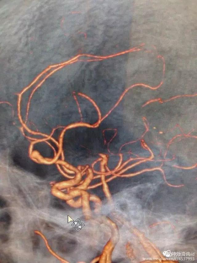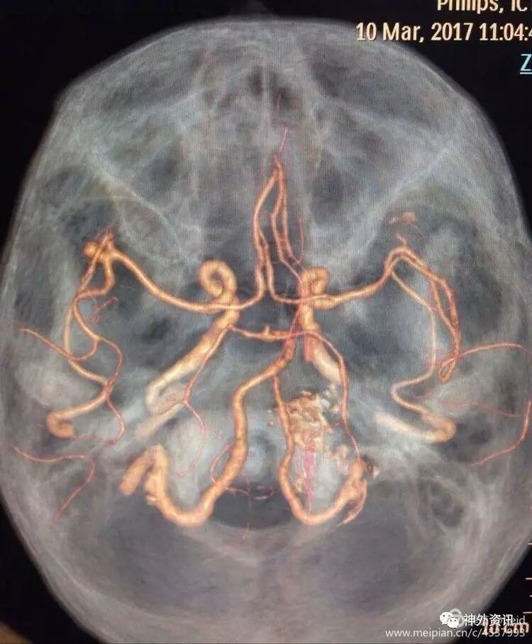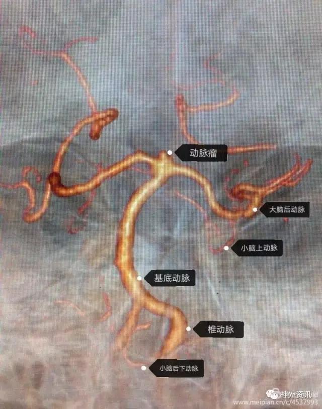 CTA提示基底动脉尖不规则形状动脉瘤,同时左侧大脑中动脉M1末端囊状动脉瘤。