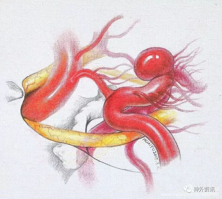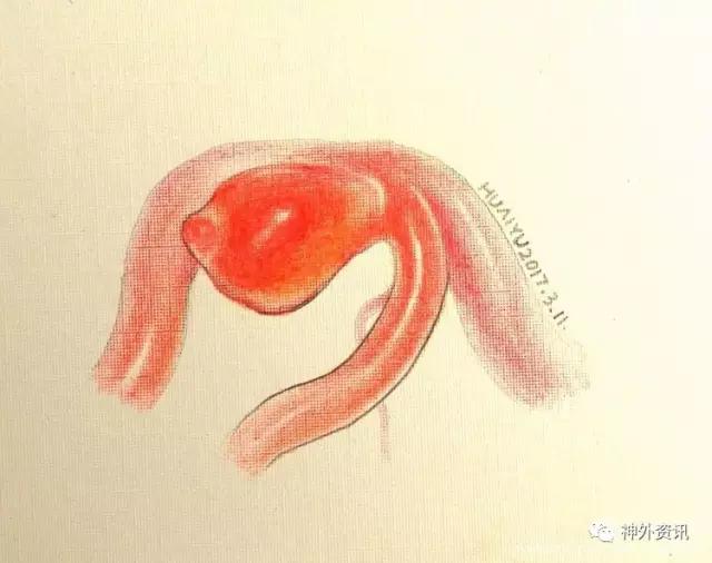 大脑中动脉动脉瘤手绘图显示术中所见形态。