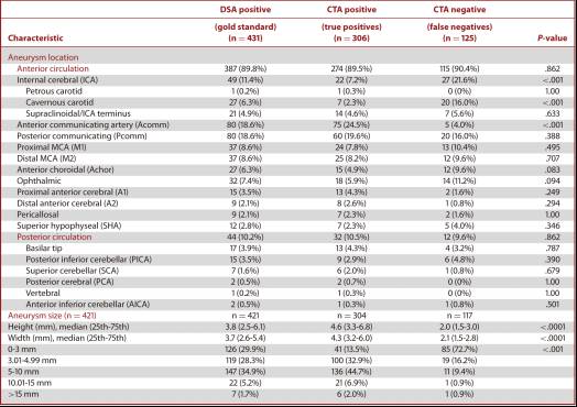 表1. CTA诊断和漏诊的动脉瘤直径和部位。