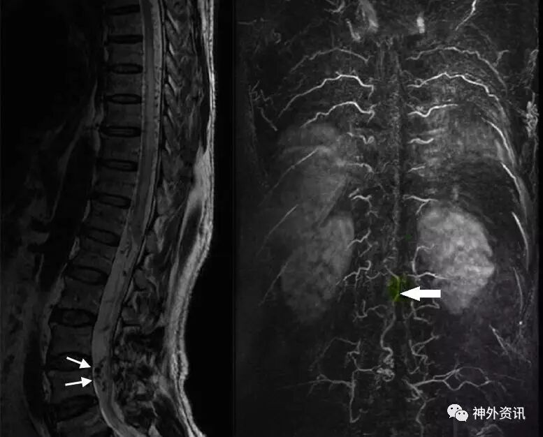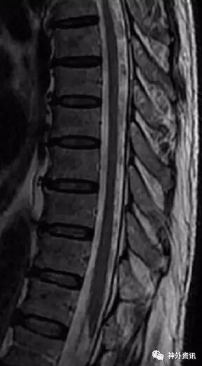 图1. MRI检查提示胸椎-腰椎椎管内见迂曲增粗血管影,所示脊髓圆锥呈长T2信号。