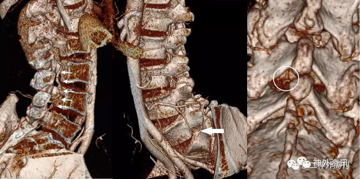 图2. CTA检查提示椎管内扩张的血管起始于左侧腰4椎间孔,左侧腰动脉的分支从腰5椎间孔进入椎管。左侧腰4/5椎板间隙可见椎管内的扩张血管。