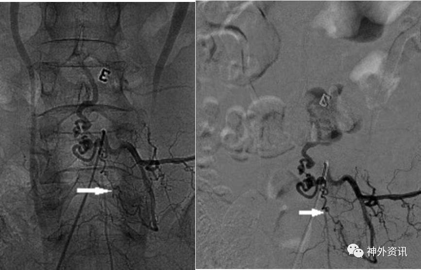 图3. DSA检查显示瘘口(白色箭头所示)位于腰4椎体水平,左侧腰4腰动脉的分支由腰5椎间孔进入椎管。