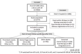 作者收集瑞典卒中注册中心—Riksstroke从2005至2012年登记的首次发生ICH的房颤患者信息,并通过Riksstroke与其他全国性的数据库联网,获取患者的治疗、合并症以及预后等相关临床资料(图1)。分析此类患者血栓形成、出血的累积发病率,推测对高危与低危患者抗凝的最佳治疗时机。该研究的最终结果是血管意外导致病死率或非致命性卒中的复发状况。