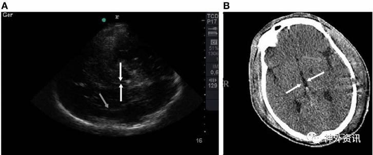 图2. A图中TCCS的白色箭头对指的是间脑平面第三脑室,灰色箭头指向大脑外侧裂,与B图中 CT扫描结果相对应。