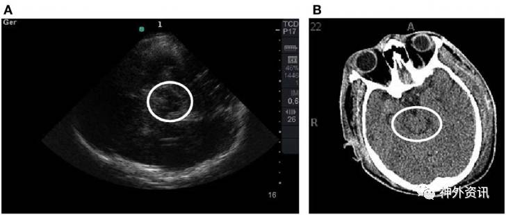 图1. A图中TCCS的白圈内中脑平面蝴蝶翼样结构,与B图中CT扫描结果相对应。