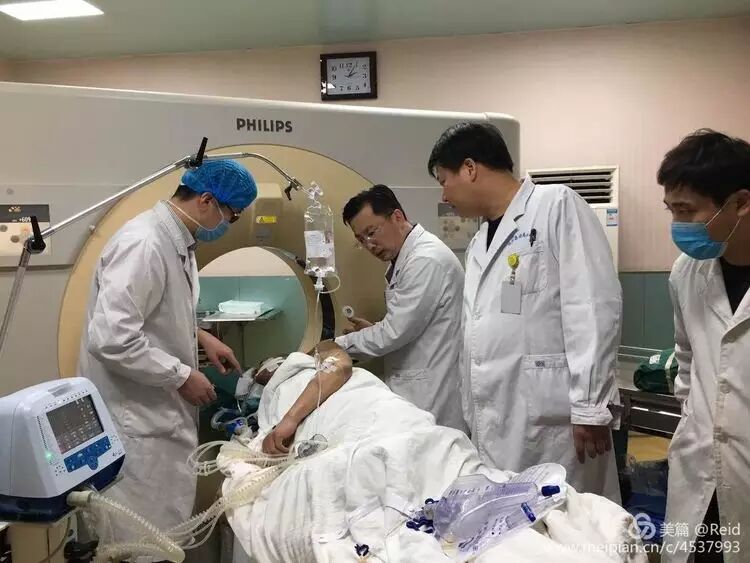 术后第5天,病人自主睁眼,可以随声音方向转动眼球,刺激后肢体屈曲动作明显,继续呼吸机自主呼吸模式(压力支持10cm水柱)辅助治疗。