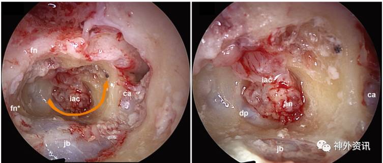 图4. 右侧EETTA入路手术照片。左图:从外侧向内侧,在耳前庭下方沿内听道环磨除骨质,成马蹄形(橙色箭头),探查并打开内听道的前、下和后壁;右图:解剖内听道,直至打开内听道孔至颞骨内侧面的硬脑膜,到达小脑桥脑角区。缩略词:dp=内听道孔处的硬脑膜;其余见图2。