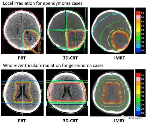 图1. 三种放射疗法的剂量设计。上图:室管膜瘤的局部放疗;下图:生殖细胞瘤的全脑室放疗。