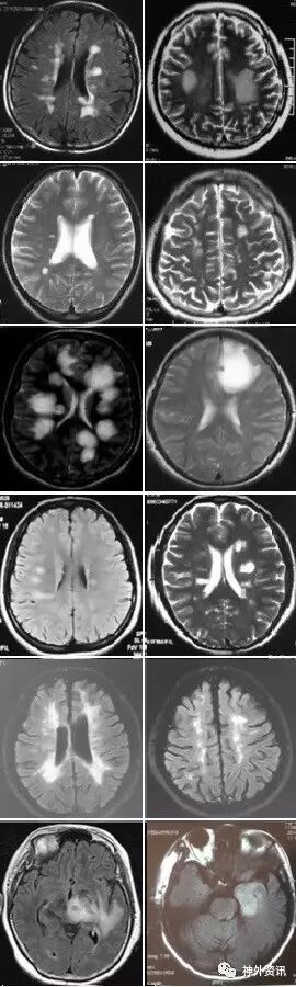 脱髓鞘,多发性硬化(MS)、视神经脊髓炎(NMO)、急性播散性脑脊髓炎(ADEM)、MOG相关性脱髓鞘病变、自身免疫性脑炎、CNS血管炎、神经系统结节病、Susac's Syndrome、Clippers’综合症、桥本氏脑病等。还有如急性、亚急性的放疗损伤等。