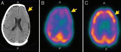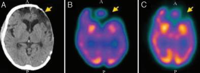 图4. A.颅脑CT显示左侧颅骨缺损;B.颅脑SPECT示术前脑血流灌注低;C.颅脑SPECT示术后脑血流灌注较术前改善。