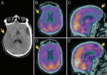 图1. A.颅脑CT显示右侧颅骨缺损;B、C.颅脑SPECT示术前额叶、顶叶、枕叶的脑血流灌注降低;D、E.颅脑SPECT示术后脑血流灌注较术前改善。
