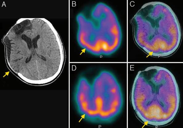图3. A.颅脑CT显示右侧颅骨缺损;B、C.颅脑SPECT示术前枕叶脑血流灌注低;D、E.颅脑SPECT示术后枕叶脑血流灌注较术前改善。