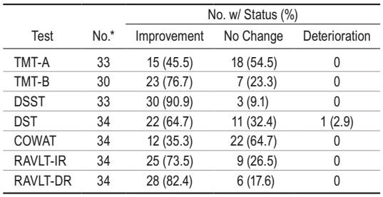 表1. 颅骨成形术后患者的神经认知功能测试结果。
