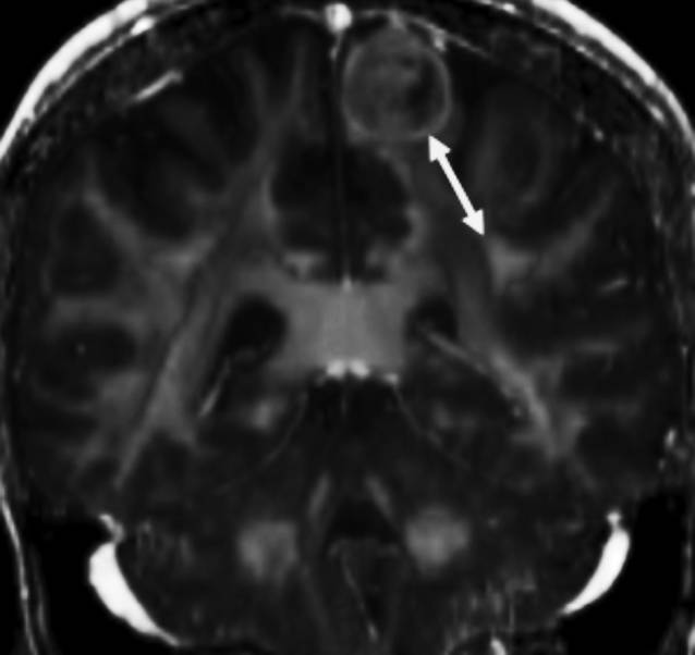 图1. MRI-T2加权冠状位成像中,白色箭头表示肿瘤病灶至上纵束间的最短距离(LTD)。