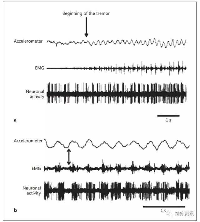 图1. Vim核团神经元放电和肌电图信号记录。a示震颤自发性起始,与神经元发电频率相关;b示震颤与肌电图和神经元活动具有明确的关系。