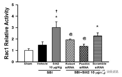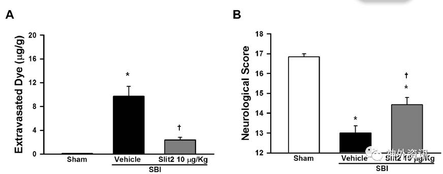 该研究将70只雄性SD大鼠,随机分至假手术组与SBI组。在SBI后6h、12h、24h和72h评估内源性Slit2、Robo4和桩蛋白(Paxillin)的表达。接着注射Slit2重组蛋白评估其对BBB的保护作用。进一步实验分组为:假手术组、SBI空白组、SBI+Slit2(10μg/Kg)组、SBI+Slit2(10μg/Kg)+Robo4 siRNA组、SBI+Slit2(10μg/Kg)+桩蛋白 siRNA组和SBI+Slit2(10μg/Kg)+Scramble siRNA组。Slit2重组蛋白或盐水均在SBI前1h经腹腔内注射。采用伊文思蓝染色、western-blot和免疫组化等技术检测蛋白表达和评估脑水肿;采用Garcia法对大鼠神经功能进行测定。