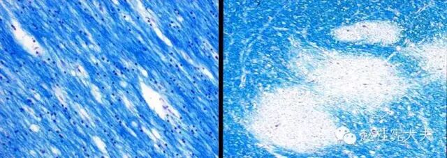 至慢性非活动期,斑块显示较少的炎性反应,小胶质细胞和巨噬细胞罕见,斑块逐步向纤维性星形细胞胶质“瘢痕”演化,轴突密度大大减少。